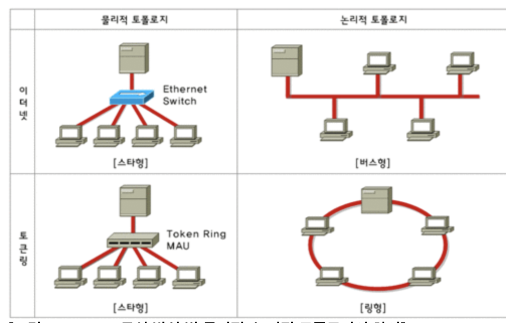 | 토폴로지 | 버스형, 스타형 | 링형 |