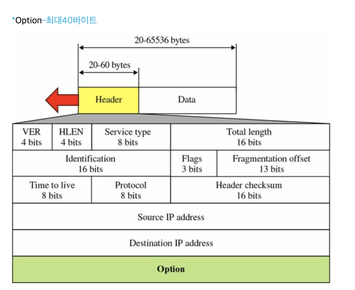 총 20Byte의 기본길이와 옵션을 사용해 크기가 최대 60Byte까지 가질 수 있음