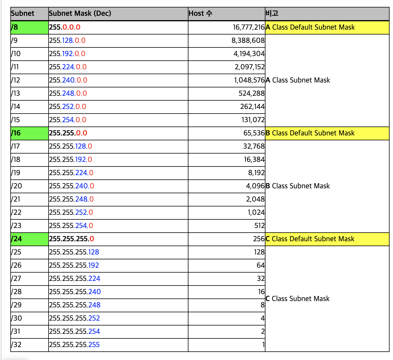 - 네트워크 ID 비트 개수를 서브넷 마스크로 표시