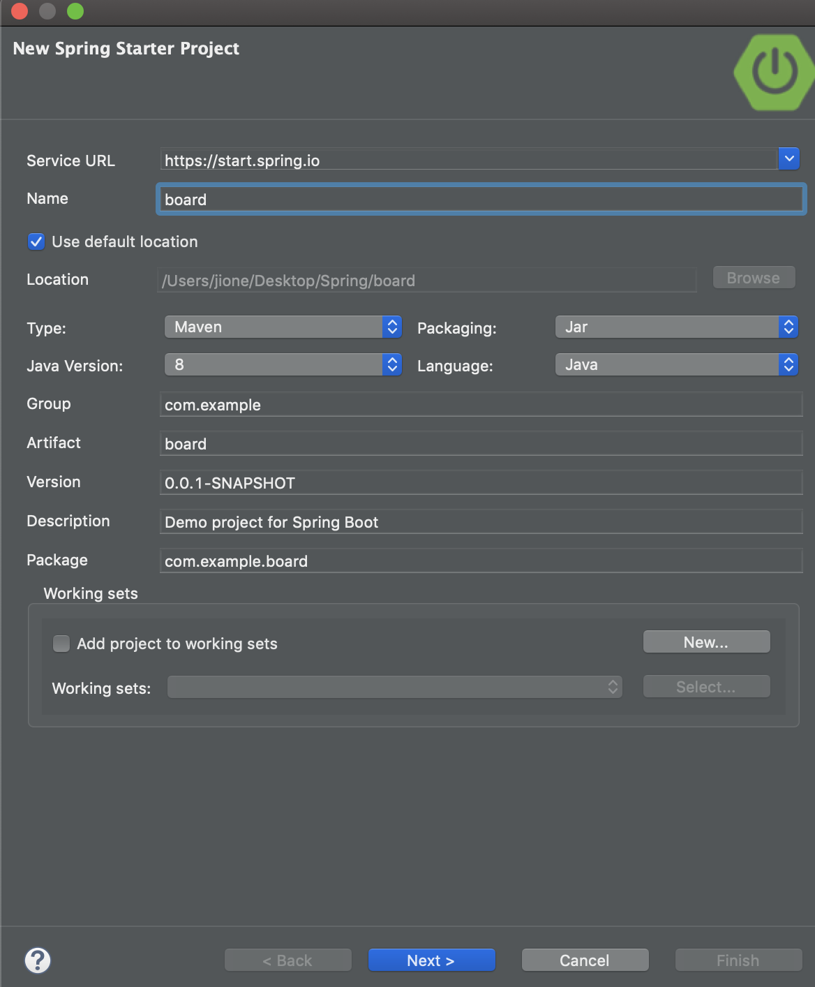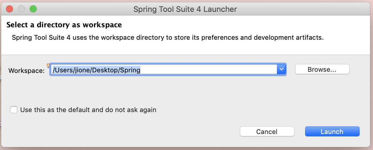 1. Spring 실행 후 프로젝트 저장할 위치 지정