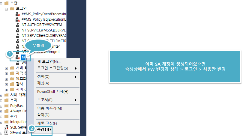 기본 관리자 계정인 SA의 PW 변경과 사용