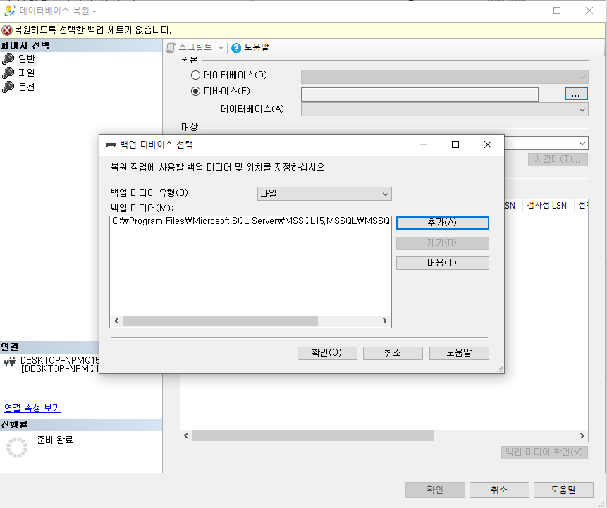 데이터베이스 우클릭 > 데이터베이스 복원 > 디바이스