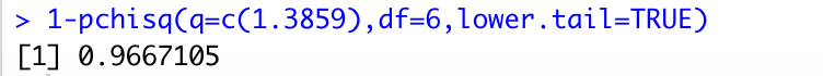 1-pchisq(q=c(1.3859),df=6,lower.tail=TRUE)// 카이제곱분포의 누적분포 함수를 이용한 p-value 계산