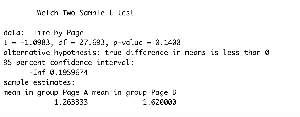 t.test(Time~Page,data=session_times,alternative="less")