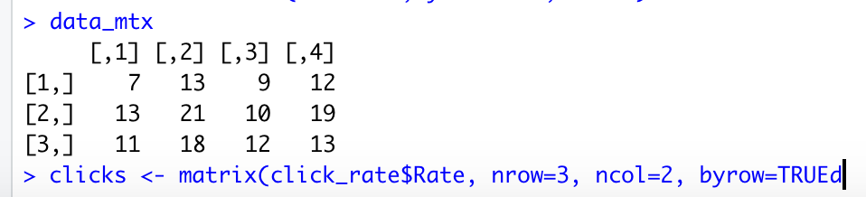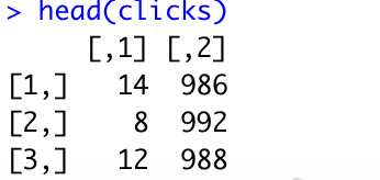 clicks <- matrix(click_rate$Rate, nrow=3, ncol=2, byrow=TRUE)