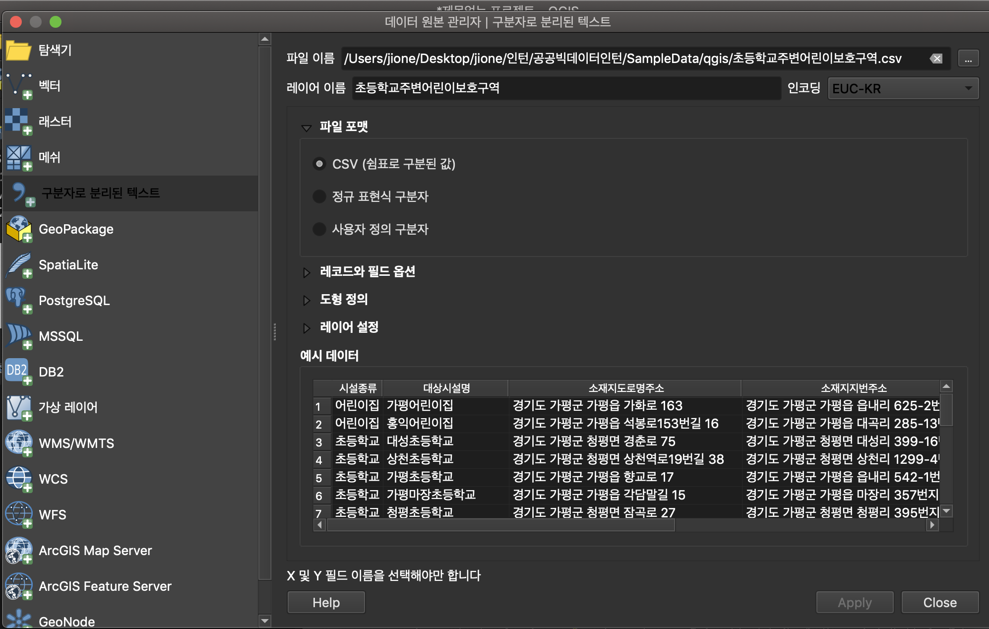 레이어 추가하기 - 구분자로 분리된 텍스트 파일(CSV)에서 불러오기