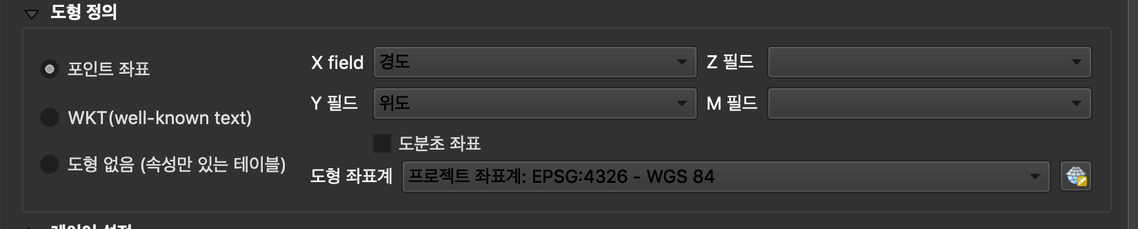 도형 정의 > 포인트 좌표 > X필드 : 경도, Y필드 : 위도 선택