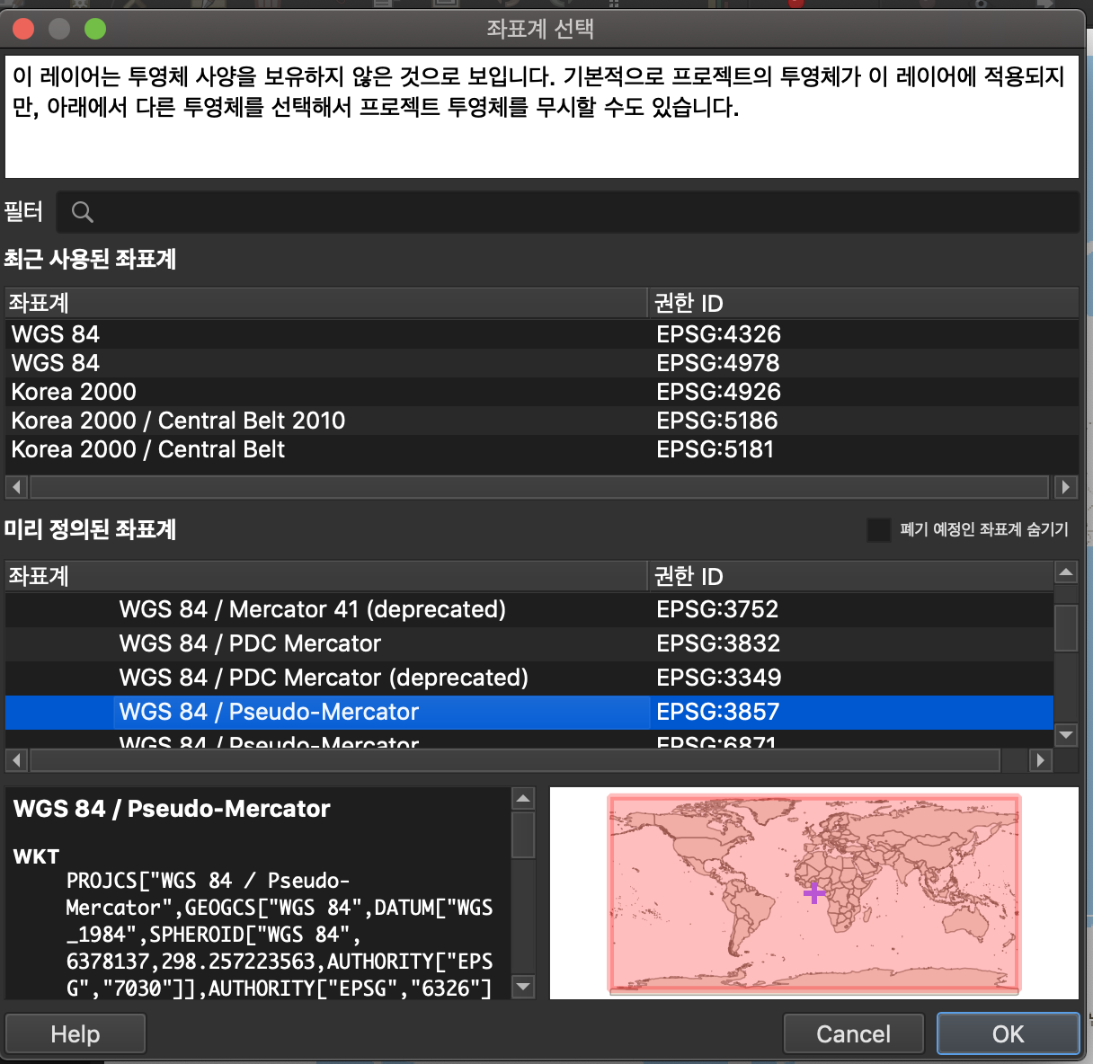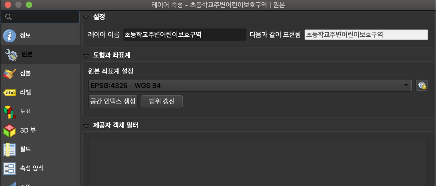 일반정보 > 좌표 체계 선택하여 WGS84 지오메트리 설정함