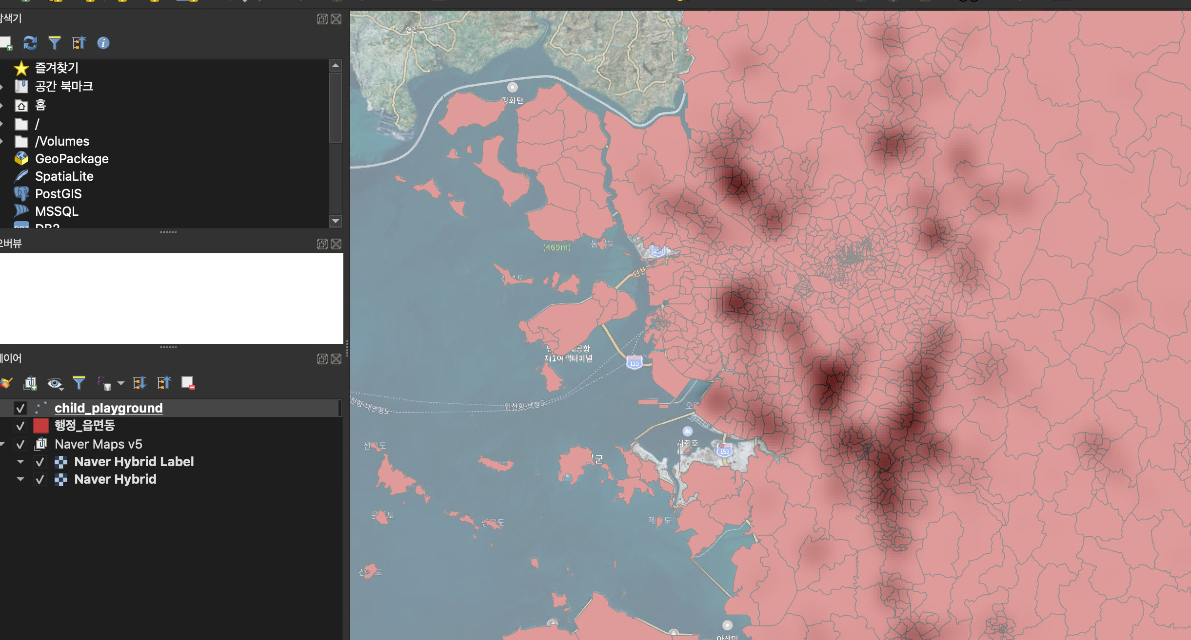 * child_playground layer는 열지도(히트맵)으로 설정 (속성 > 심볼 > 열지도선택)