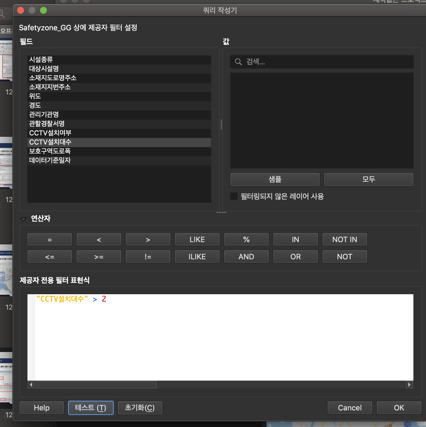 Safetyzone_GG(경기도 학교 안전 지역 위치) 우클릭 > 필터 설정 > 쿼리 작성기