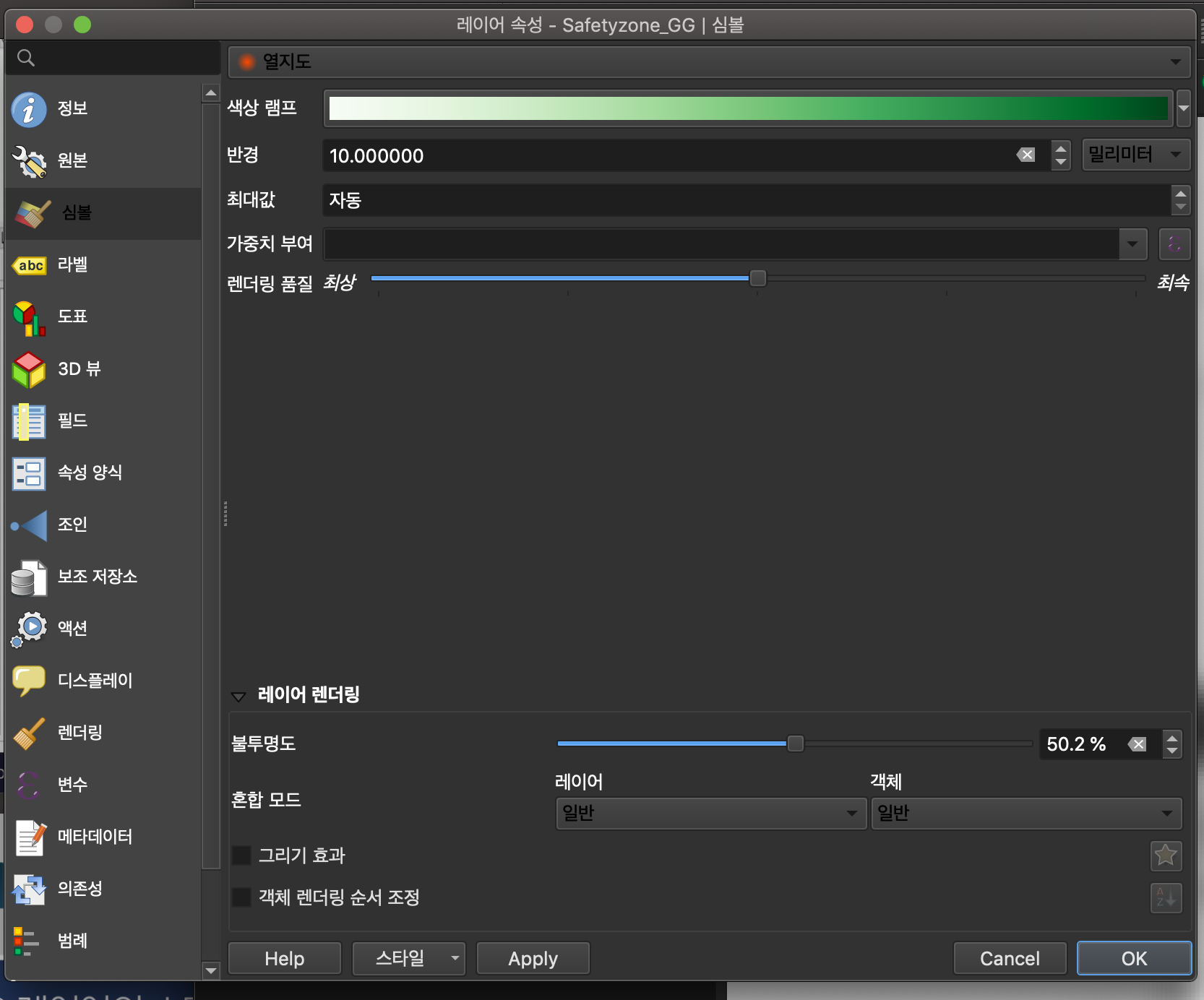 - 레이어의 스타일을 열 지도로 선택으로 하여 공간시각화 결과 확인