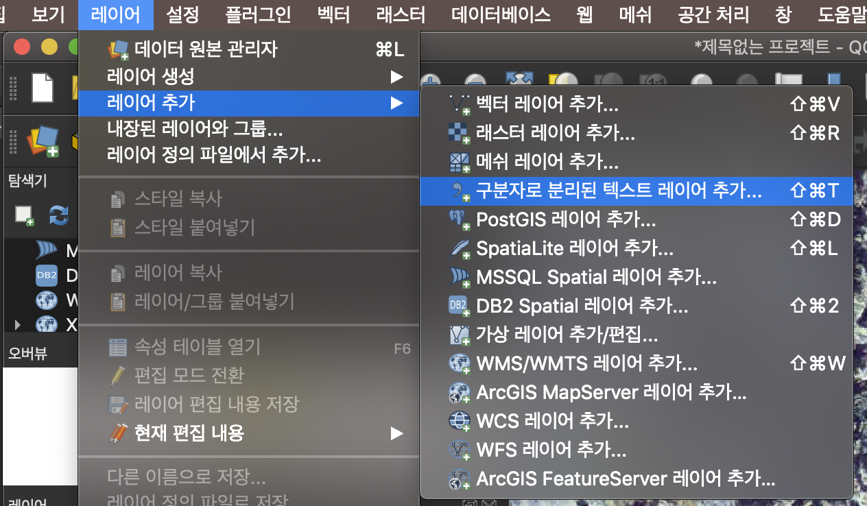 - 레이어 추가하기 : 구분자로 분리된 텍스트 파일(CSV)에서 불러오기