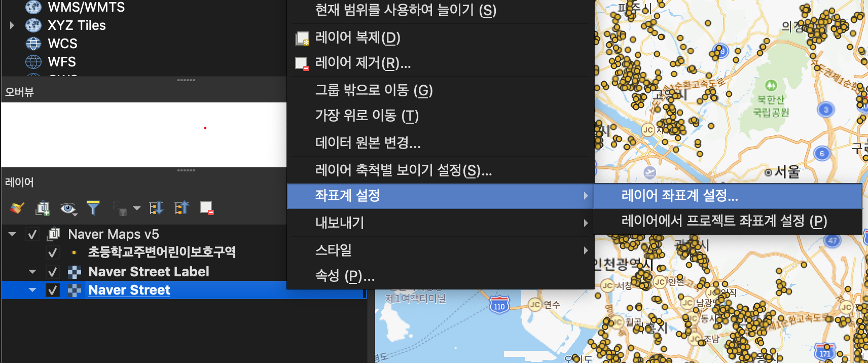 Naver Street 우측 마우스 > 좌표계 설정 > 레이어 좌표계 설정