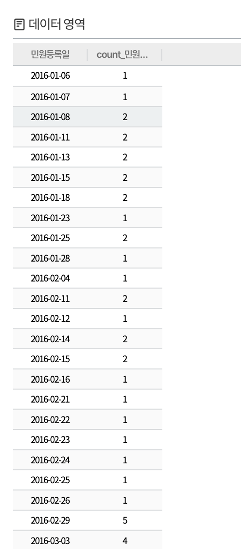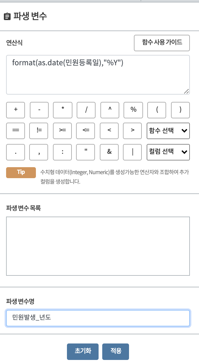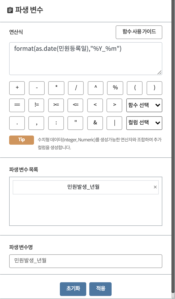 - 새 워크플로우를 생성해 민원데이터 원본을 불러오고 파생변수 생성(년월)