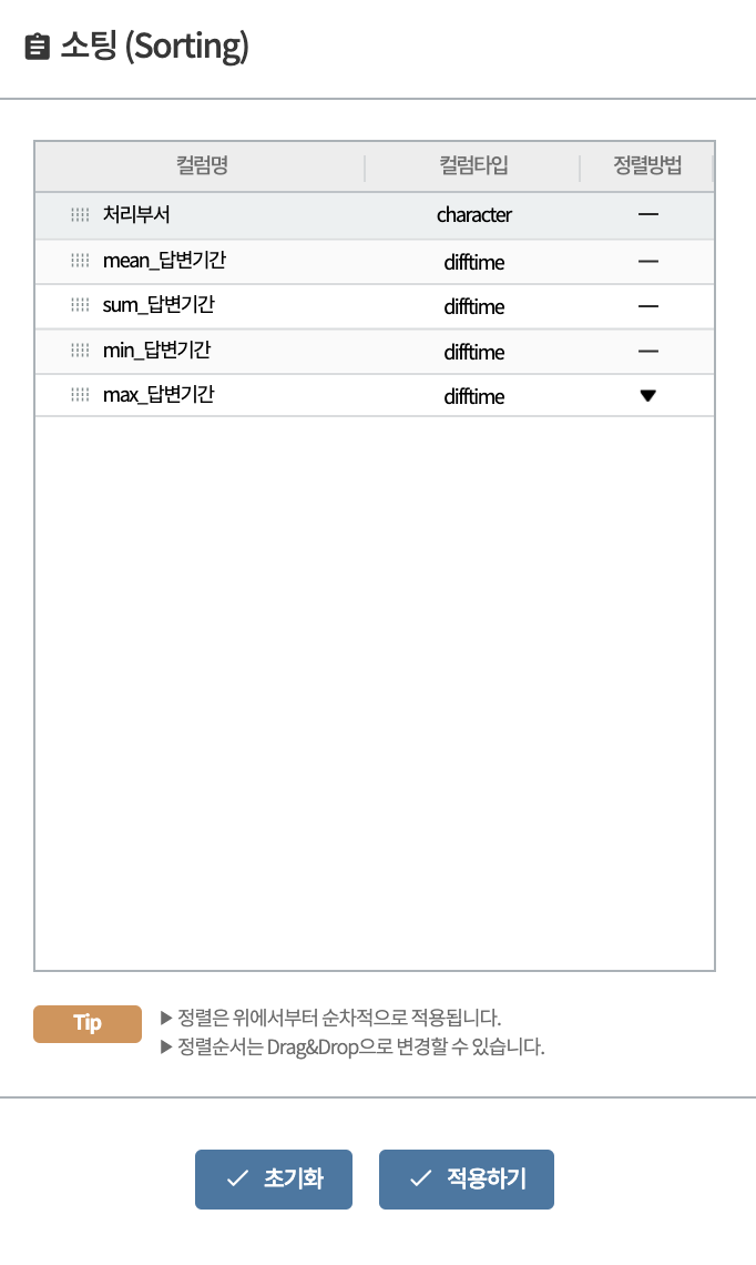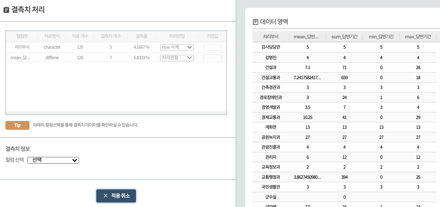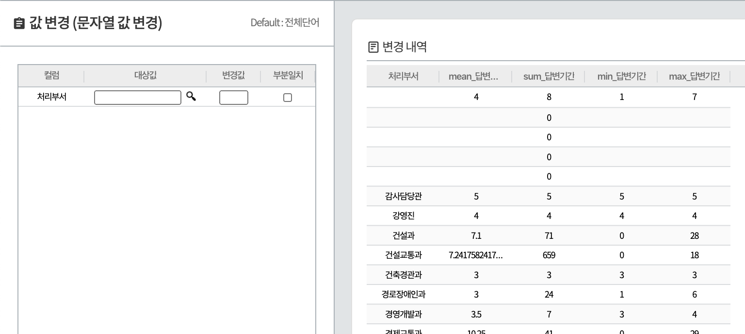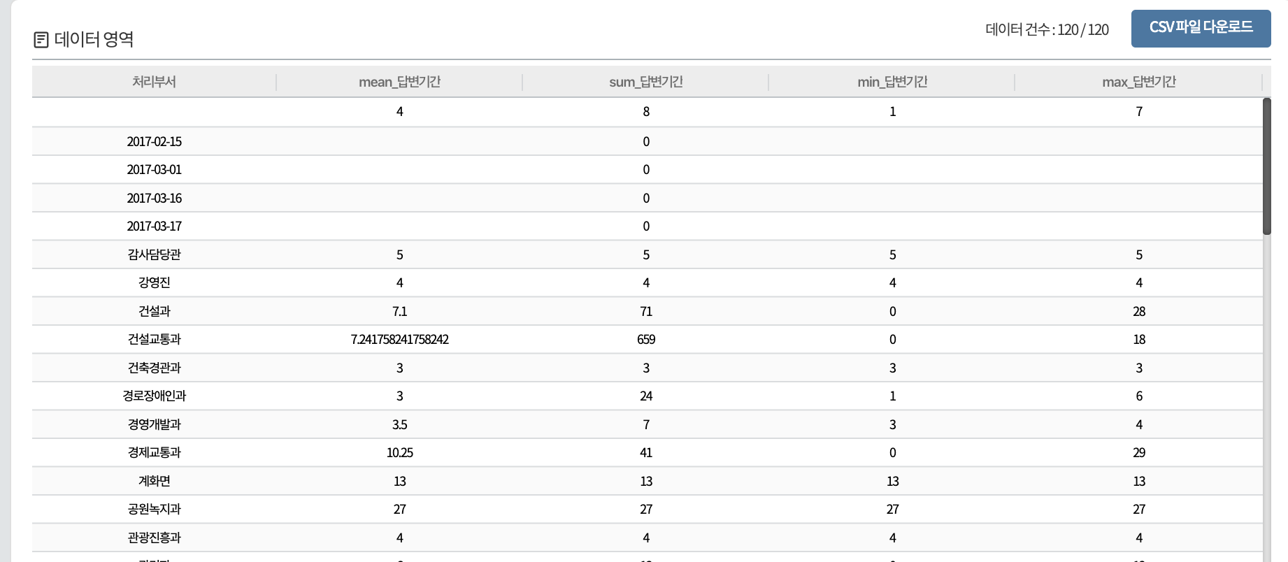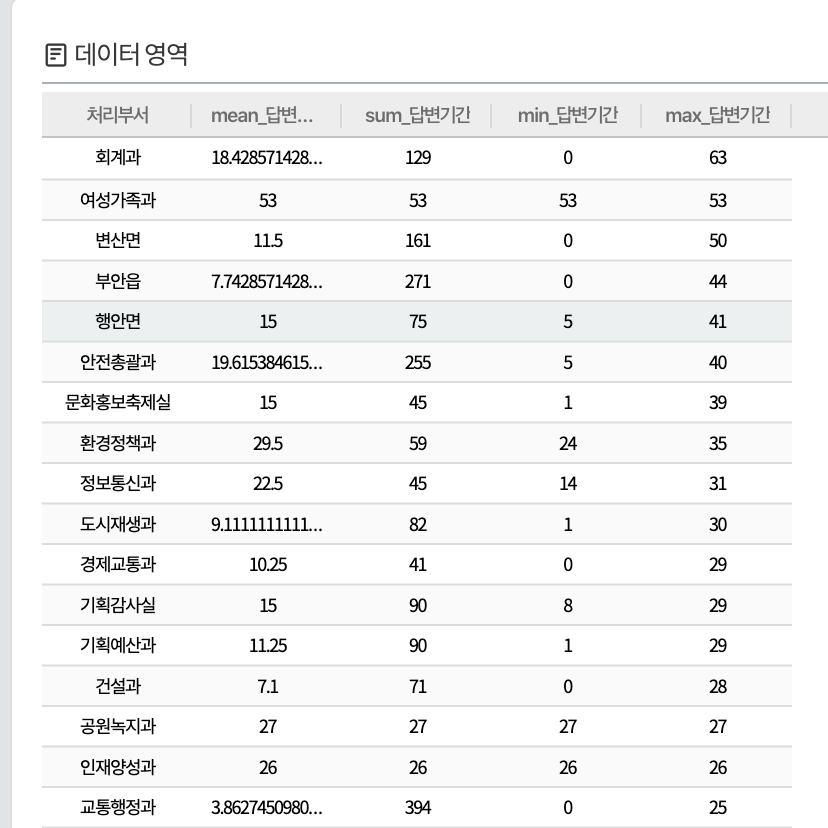 - 답변기간 변수 생성 데이터에 그룹 연산(처리부서별 답변기간)