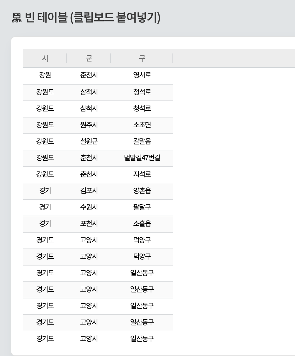 - 주소 컬럼을 시군구로 변경하고 빈테이블에 삽입