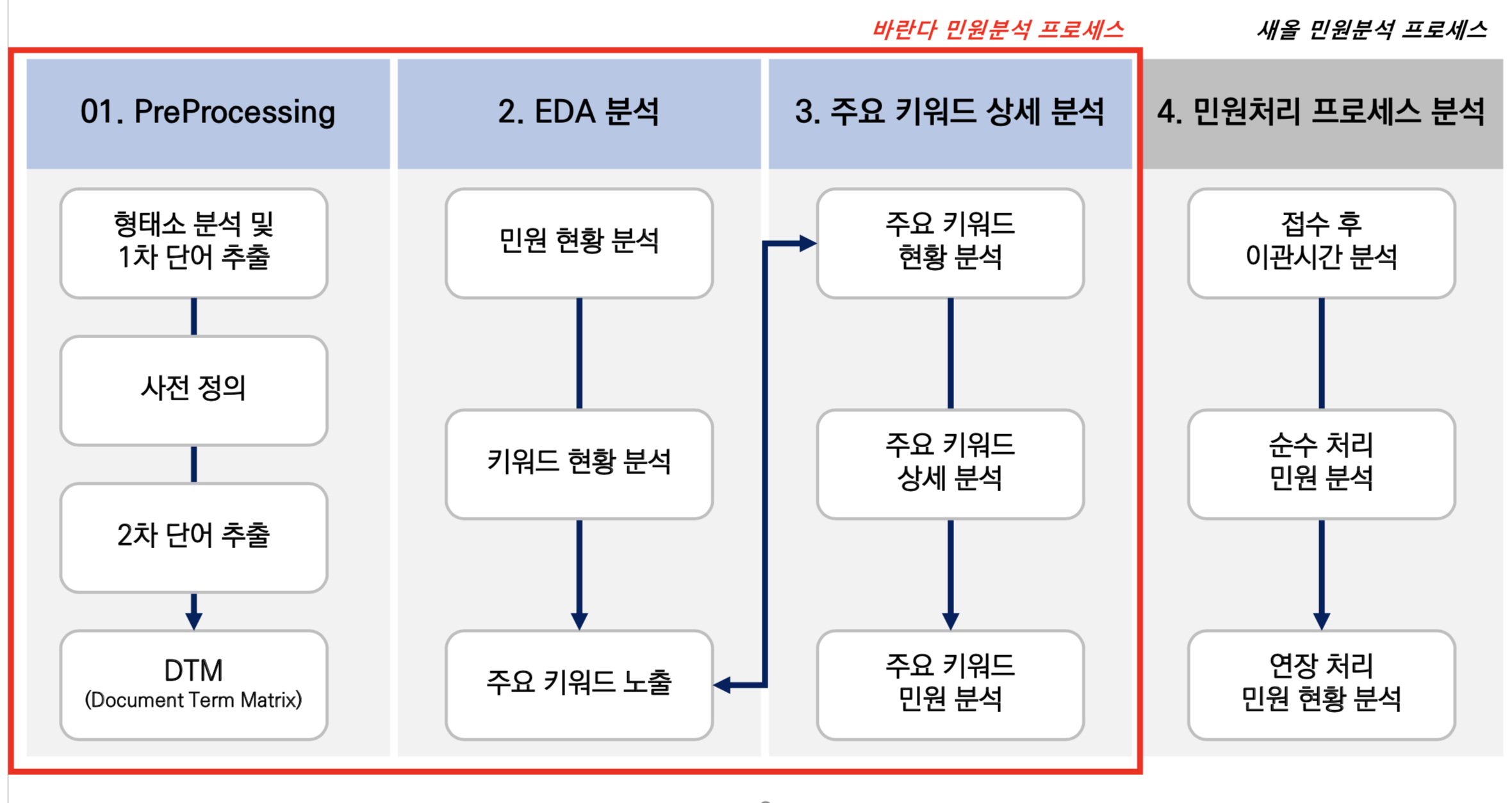 - 민원 분석에서는 어떤 민원이 주차에 관련된 민원이며, 어떤 민원이 아파트와 관련된 민원인지, 그 주제를 표현하는데 있어 어떤 키워드들이 노출되는지를 추론할 수 있음