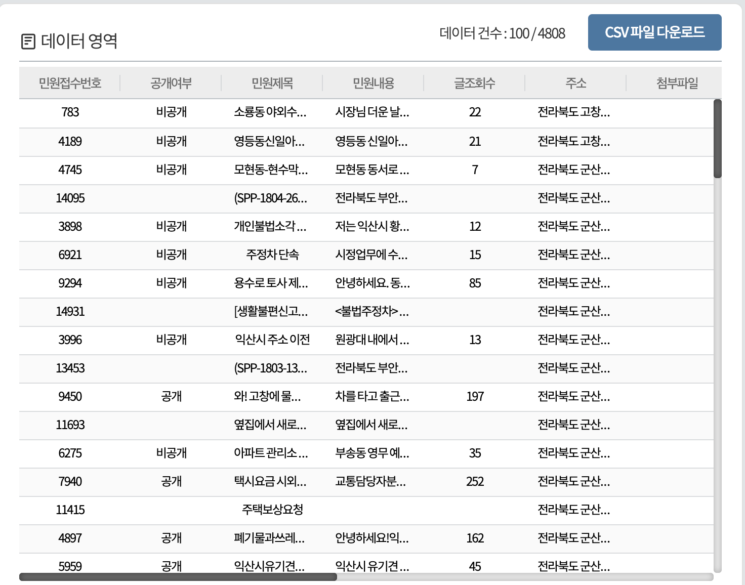 - 필터링한 자료 CSV 파일에서 민원내용을 복사해 메모장에 저장
