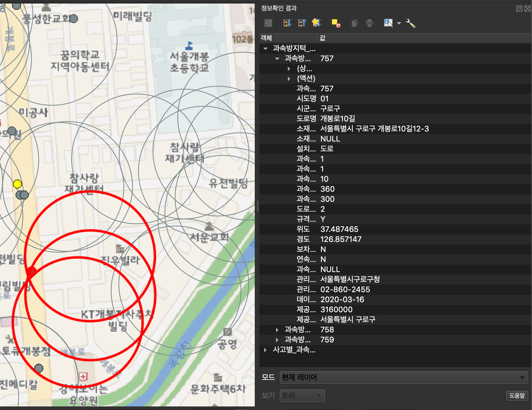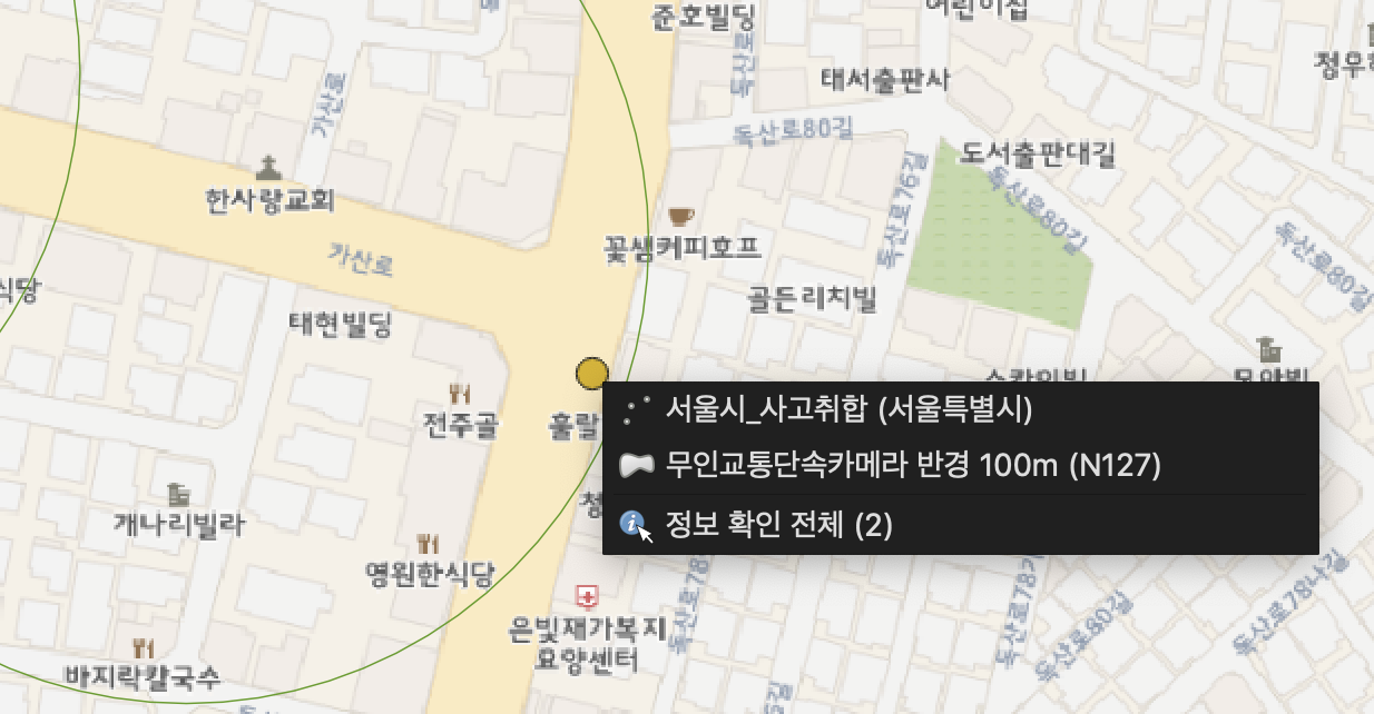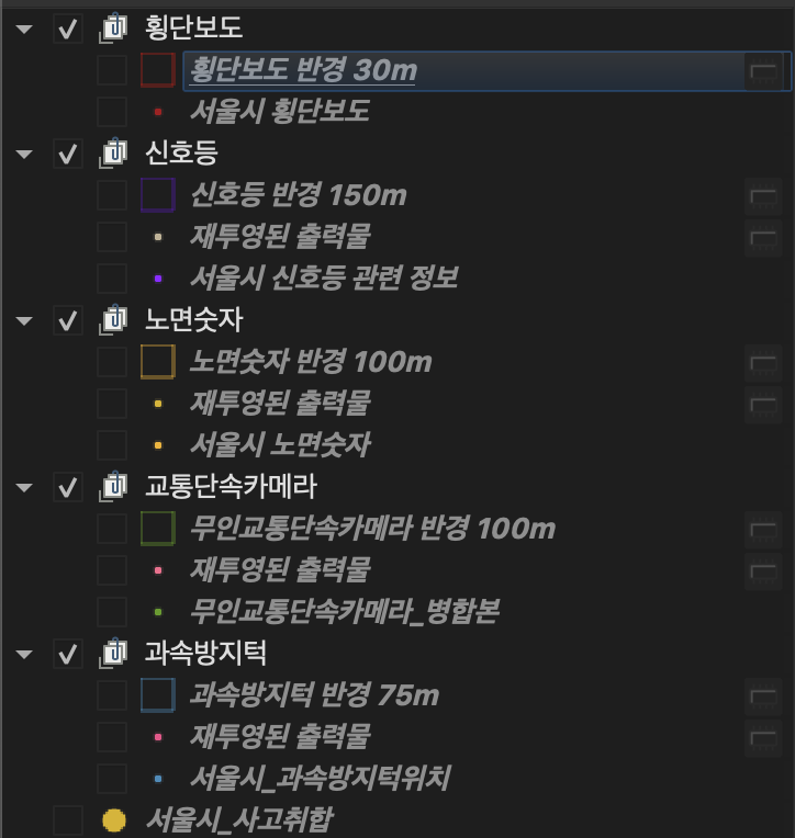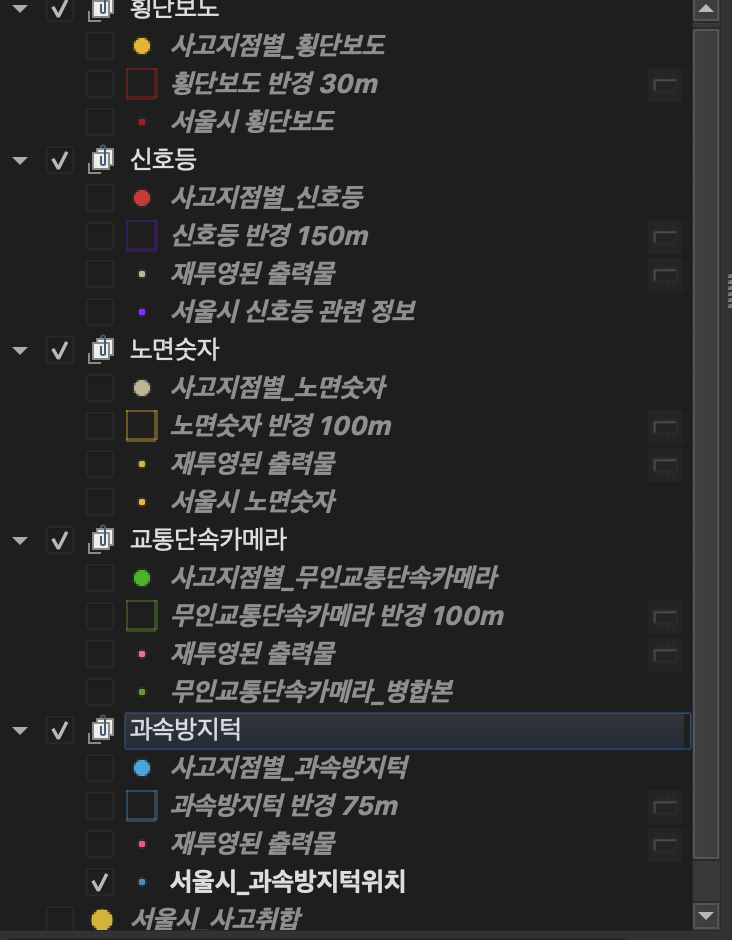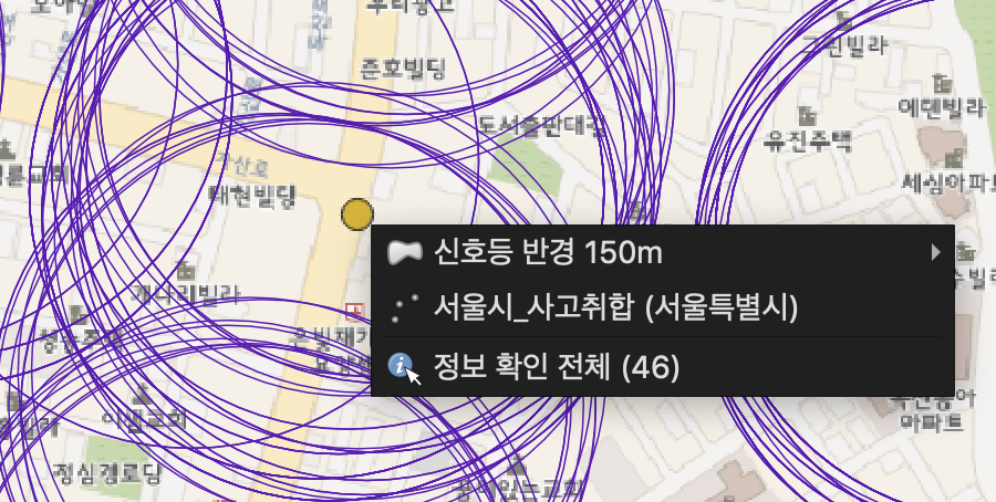 사고 다발지 데이터, 과속방지턱 반경 벡터, 교통 단속 카메라 반경 벡터 레이어를 겹침