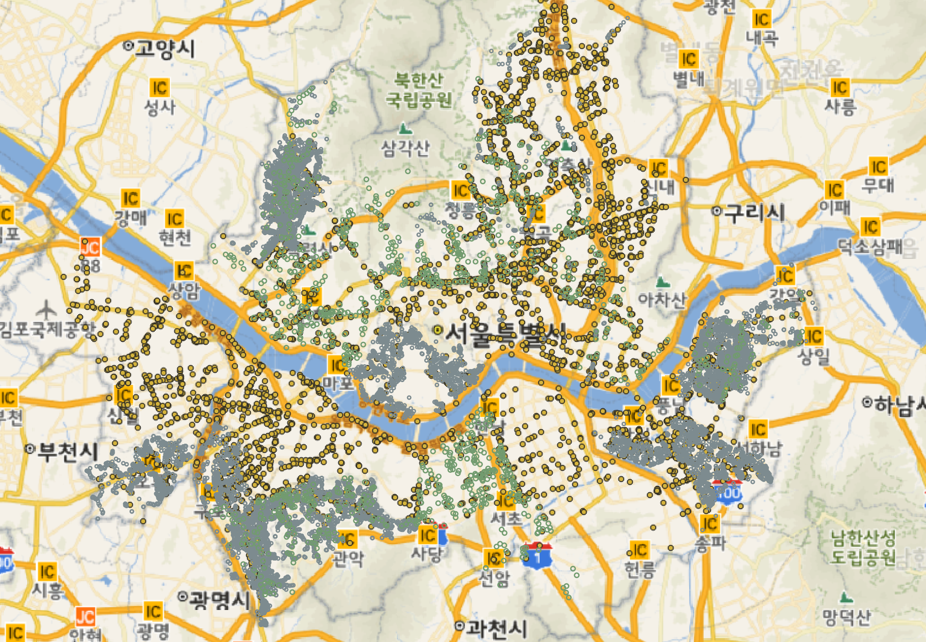 (노란색 - 사고 지점, 회색 - 방지턱 반경과 교차하는 사고 지점)