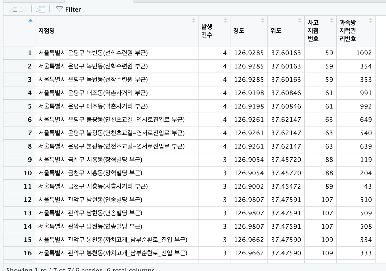 서울시 사고 다발지 데이터 불러오기