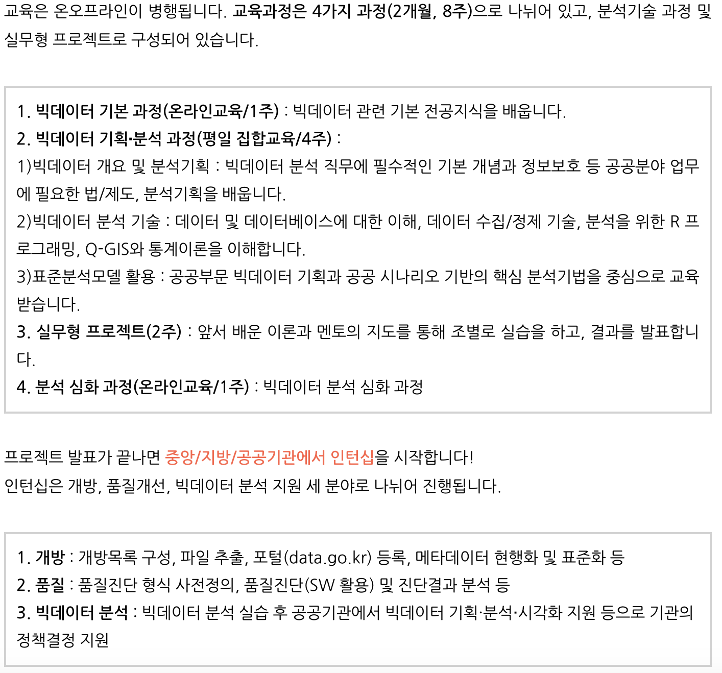 두달간 빅데이터 관련 교육(45만원 교육지원금) 후에 세달간의 공공기관 인턴십(180만원 훈련지원금)을 진행하는 프로그램이었다.